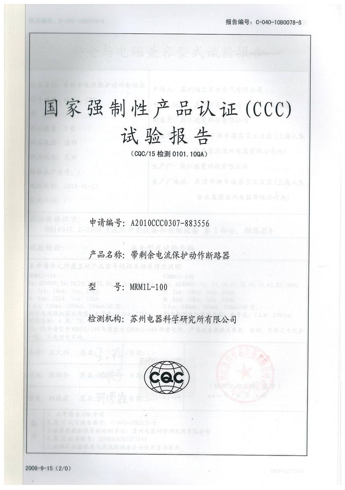 MRM1L-100塑殼漏電資質(zhì)證書