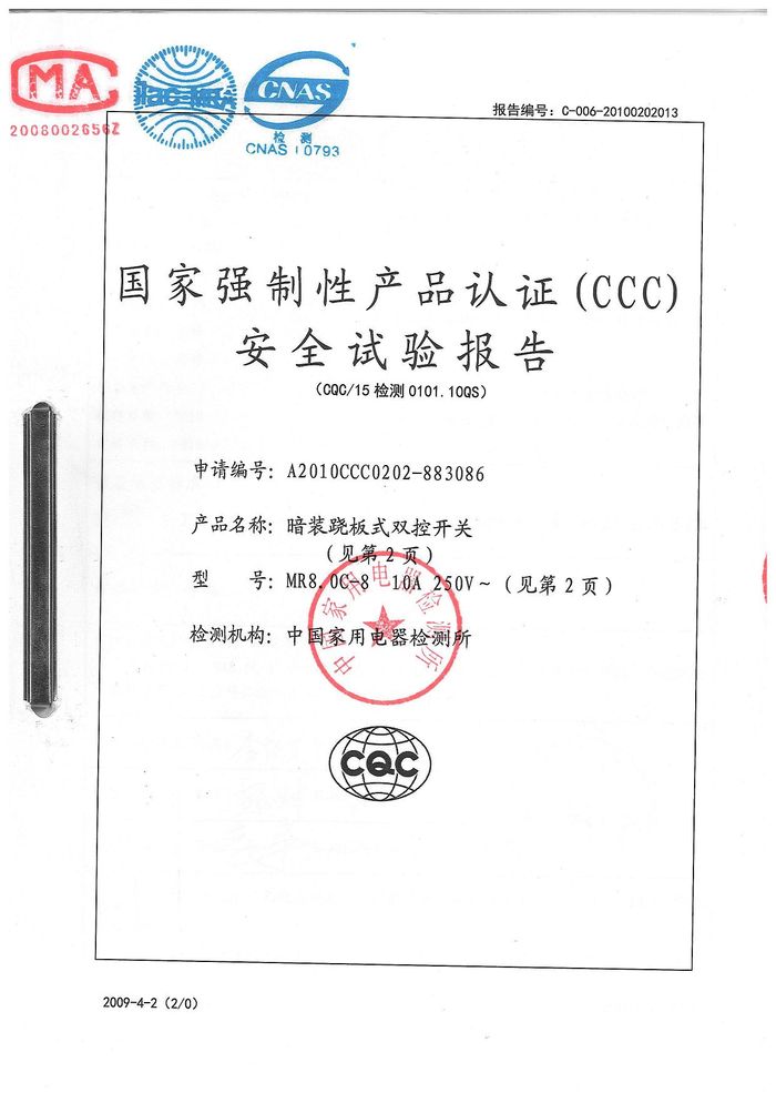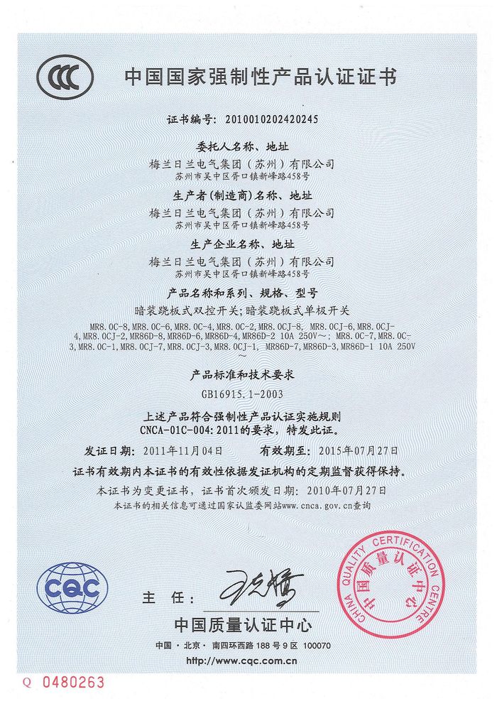 MR8.0C開(kāi)關(guān) 86D插座資質(zhì)證書