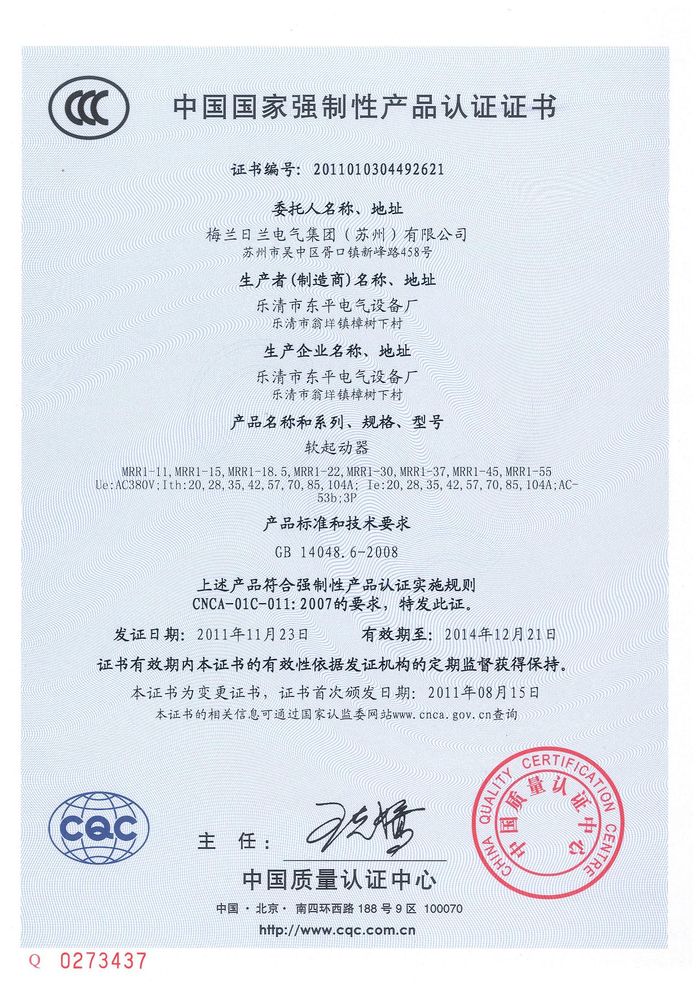 MRR1-11軟啟動資質(zhì)證書