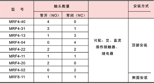 MRF系列有二極和四極兩種,該輔助觸頭組和交流接觸器或接觸器式繼電器組合后能擴(kuò)展輔助觸點(diǎn)的數(shù)量。