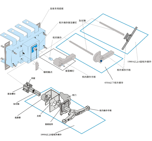 125A-630A適用于電路的接通與分斷電氣隔離,1000A以上只適用于電氣隔離。125A-630A有三極、四極(三極+可通斷中性極)。630A以下可根據(jù)需要提供有觀察窗口的產(chǎn)品,直接觀察觸頭的通斷狀態(tài)。可根據(jù)需要配裝兩組輔助觸點。電氣性能與機械性能和MRGL-125“1600A電氣性能與機械性能相對應。