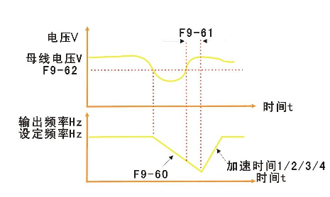 此功能指在瞬時停電時變頻器不會停機,在瞬間停電或電壓突然降低的情況下,變頻器降低輸出速度,通過負載回饋能量,補償電壓的降低,以維持變頻器短時間內繼續(xù)運行。