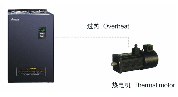 選用輸入輸出擴展卡,模擬量輸入A13可接受電機溫度傳感器輸入(PTlOO,PTlOOO)。當電機溫度越過預警值時,變頻器輸出脈沖信號提示過熱,當電機溫度超過過熱保護值時,變頻器故障輸出給電機妥善的保護。
