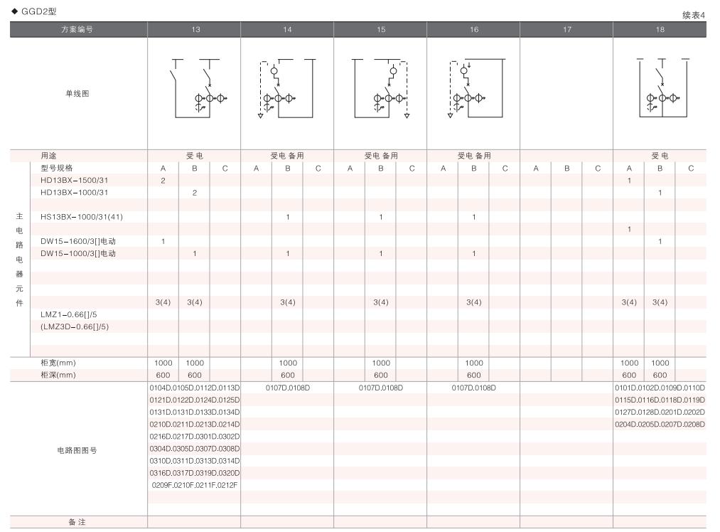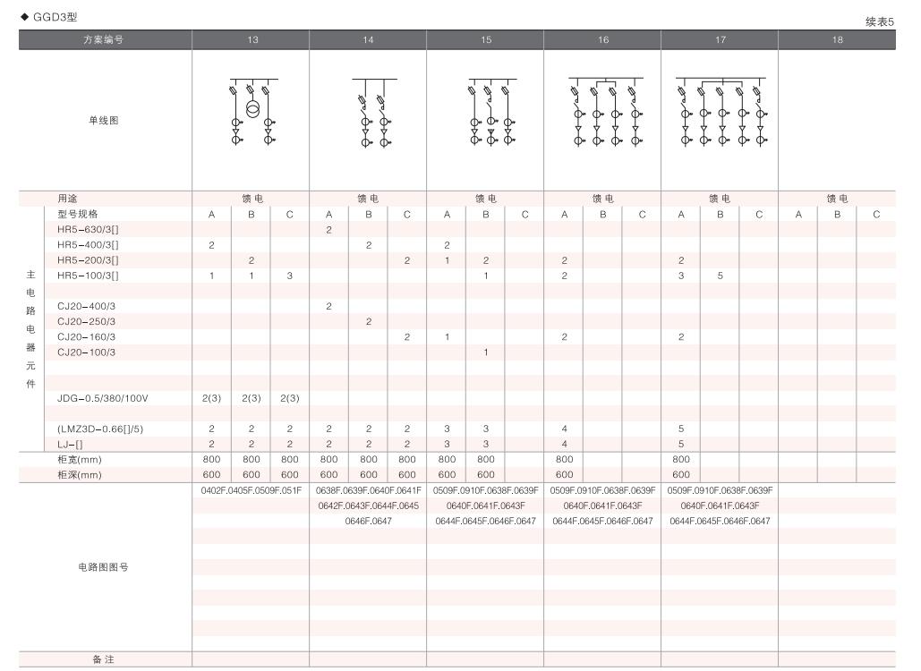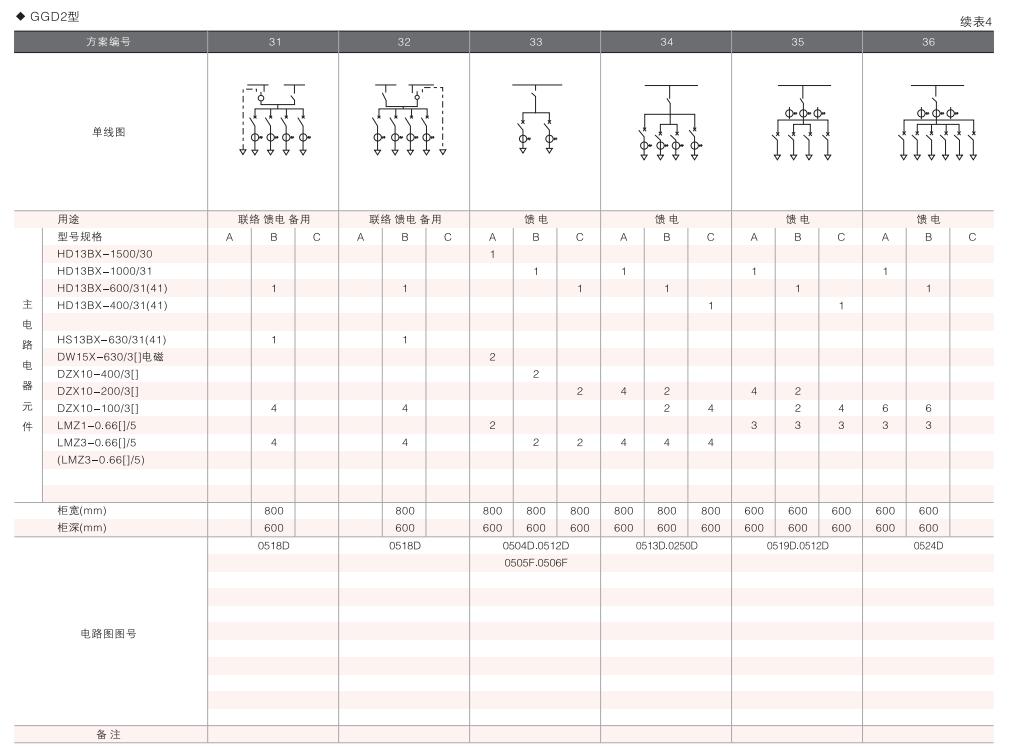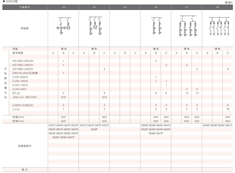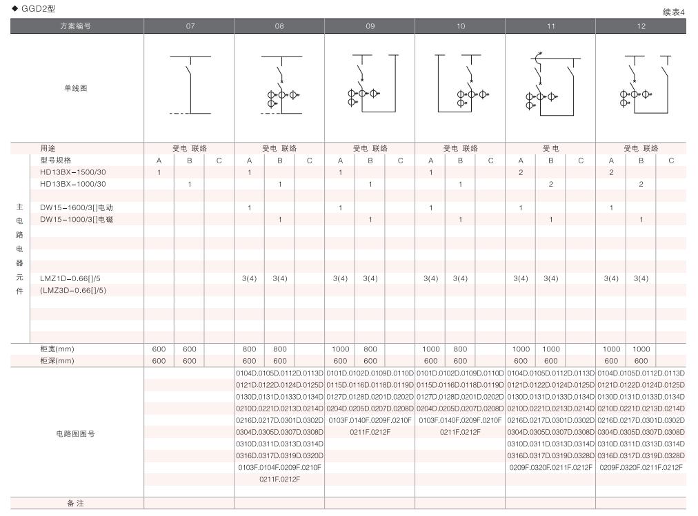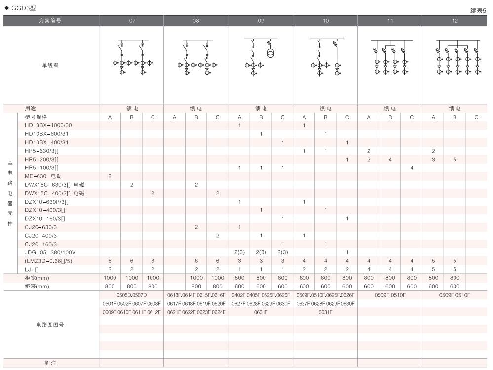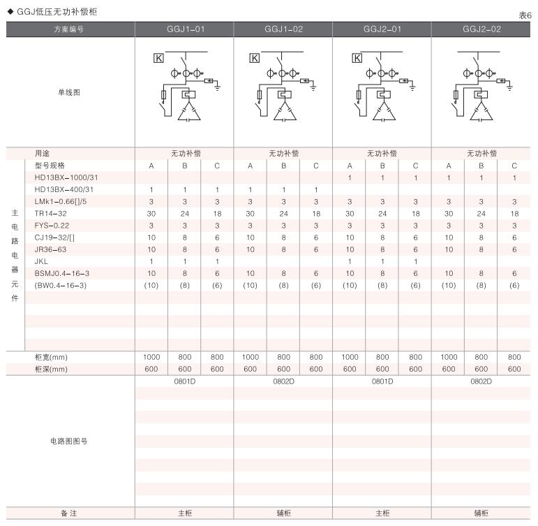 此外,為適應(yīng)無(wú)功補(bǔ)償?shù)男枰O(shè)計(jì)了GGD電容補(bǔ)償柜,其主電路方案4個(gè),共12個(gè)規(guī)格。
