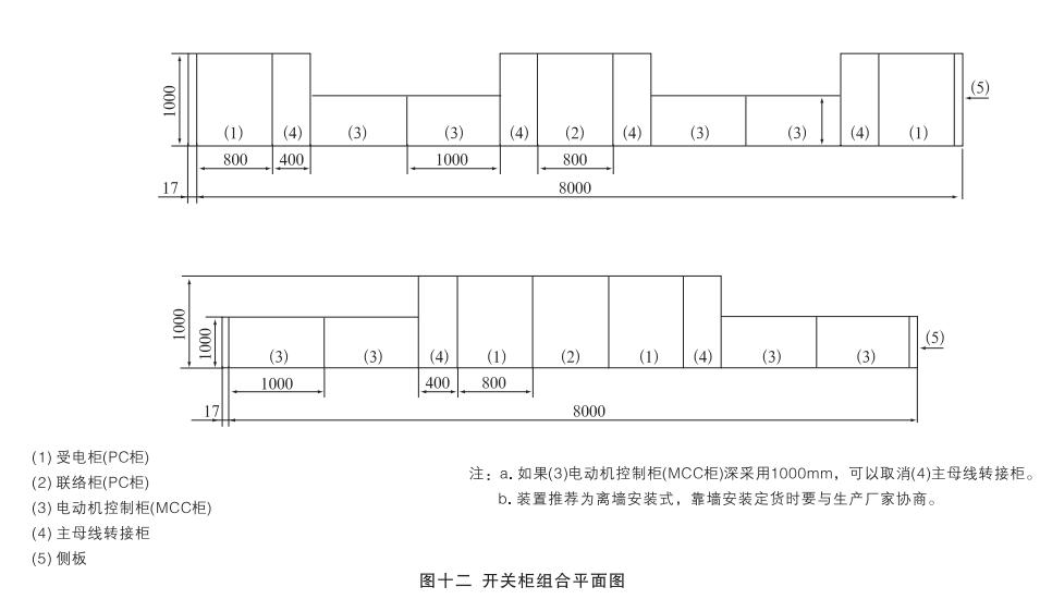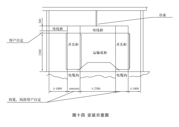安裝:開關(guān)柜就位。找準(zhǔn)位置,按圖十一所示進(jìn)行焊接,焊接節(jié)柜和焊長由用戶確定,產(chǎn)品安裝與配電室的相對位置參考圖十二,其中吊索是否安裝由用戶確定,制造商提供的原則是:當(dāng)母線橋的長度大于3米時應(yīng)考慮安裝吊索。但是,當(dāng)母線橋的電流大于或等于2500A時,其長度為2.5米時也應(yīng)安裝吊索。